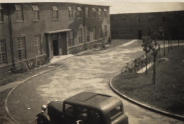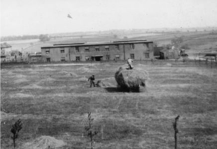 Haymaking beside the Squadron at Binbrook. Airmen's quarters in the background.
